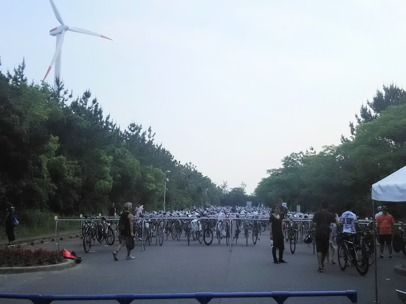 チェックイン後、バイクをラックに設置。リレーはレースナンバーが1700番台とかだったので、T1最後尾だったけど、個人はレースナンバーが若いので景色が全然違う。