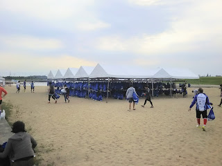 さて何とか浜に生還。立ち上がる前に、脱ぎやすくなるとのことでウェットスーツに海水を入れておきました。立ち上がるとすぐ横を泳いでいた選手も同時に立ち上がり、お互い顔を見合わせて「キツかったっすね(><)」。1.9kmの辛さを分かち合いながら浜の斜面を登っていきました。