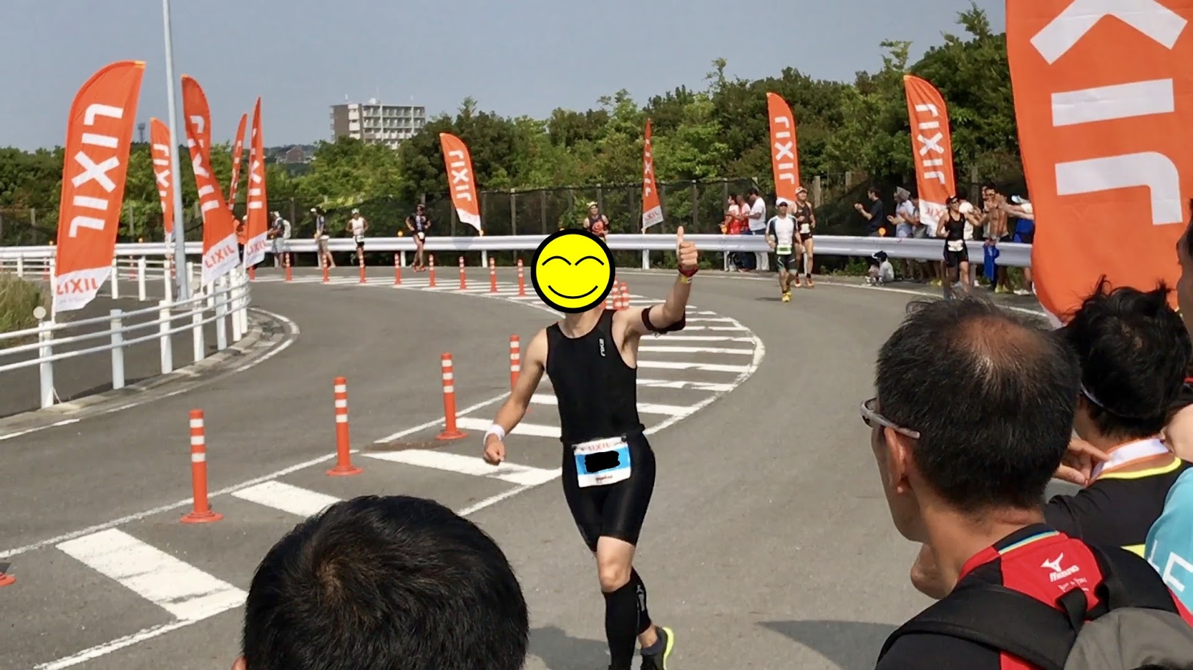 まずは、お預けUターン。沿道に人がチラホラと見え始めたところでやせ我慢ランを開始。なんか応援が聞こえたような気がしたけど人を判別する余裕なし。ここは一旦スルー。また沿道の応援が見えなくなったところで、歩きながら最後に振り絞る力を貯めます。最後のUターンをしたところで、後方から迫ってくる選手を確認。もうこれ以上歩いたら団子フィニッシュになってしまう・・・